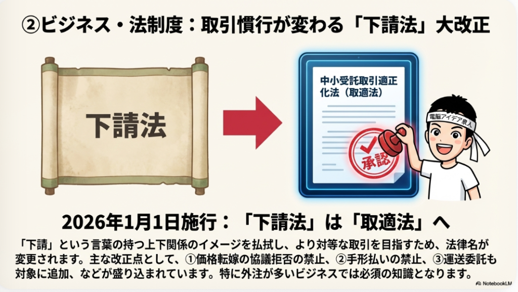 本セクションは、2026年1月から施行される、中小企業の取引慣行に直接的かつ重大な影響を与える法改正を扱います。これらは、日々の受発注、価格交渉、支払い条件といった事業活動の根幹に関わるものであり、本レポートの核心部分と言えます。