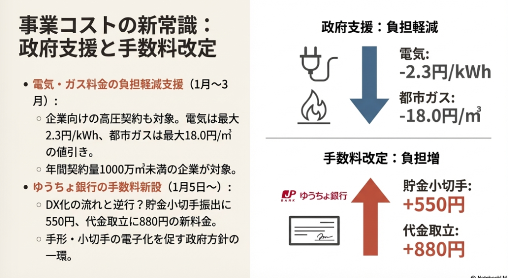 ◦ 2026年1月5日より、ゆうちょ銀行が新たに**「貯金小切手振出料金(550円/件)」および「代金取立料金(880円/件)」**を新設します。これらの取引を頻繁に利用する企業は、経費の見直しが必要になる場合があります。