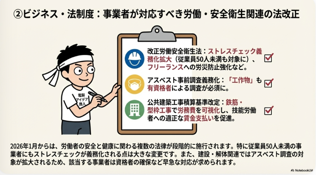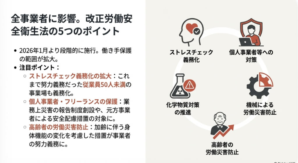 2026年1月から段階的に施行される改正労働安全衛生法は、事業規模や雇用形態の垣根を越え、すべての働く人の安全と健康を守るための重要な変更を含んでいます。