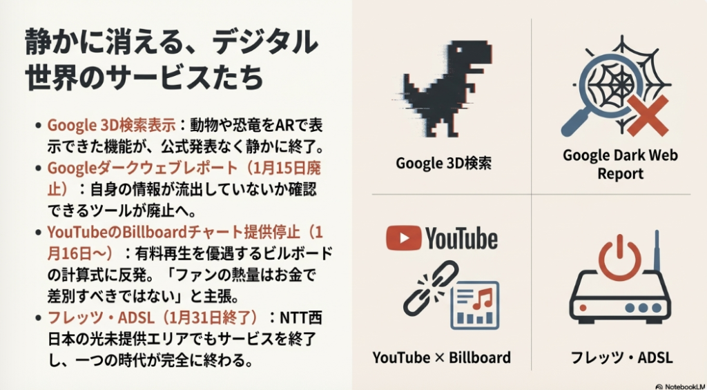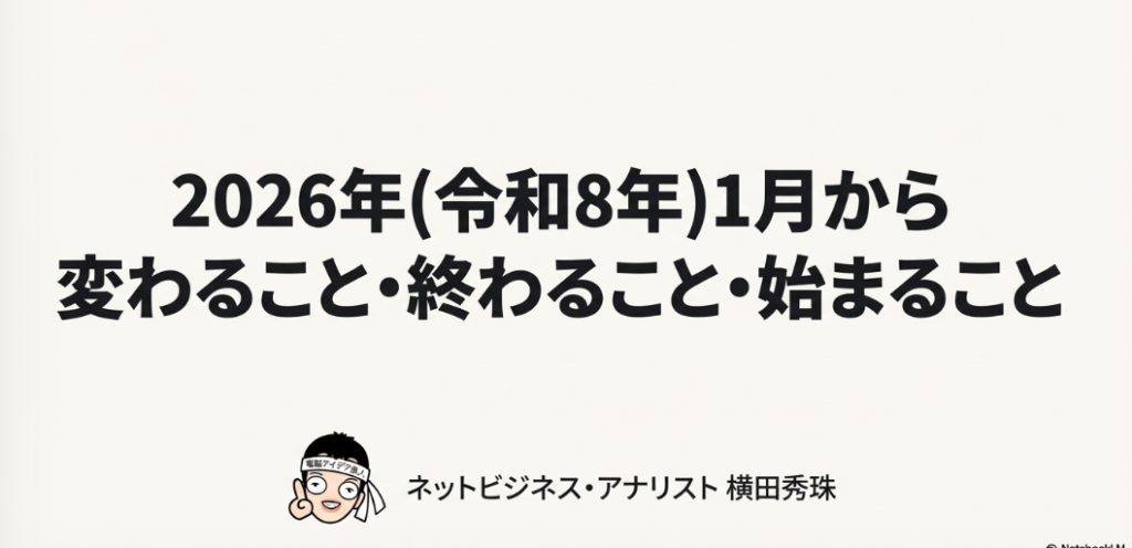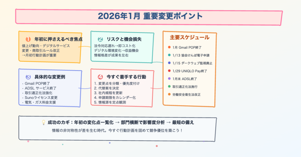 デジタル技術やオンラインサービスの変化は、もはや一部の先進的な企業だけの話ではなく、すべての中小企業の業務インフラやビジネスモデルに直接影響を及ぼす時代です。2026年1月には、対応が必須となるインフラの変更から、業務効率化の好機、そして新たな市場の創出まで、多岐にわたる変化が訪れます。
