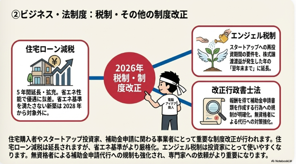 ◦ 2026年1月1日からエンジェル税制が拡充され、株式譲渡益をスタートアップに再投資した場合の優遇措置について、再投資期間が従来の「譲渡益が発生した年内」から**「譲渡益が発生した年の翌年末まで」**に大幅に延長されます。これにより、個人投資家がスタートアップへ投資しやすくなるため、資金調達を目指すスタートアップ企業や、そのエコシステムを支える関連サービス事業者にとっては好材料と言えるでしょう。