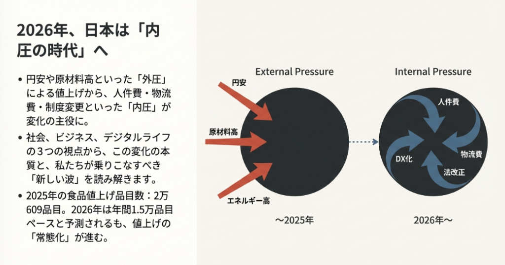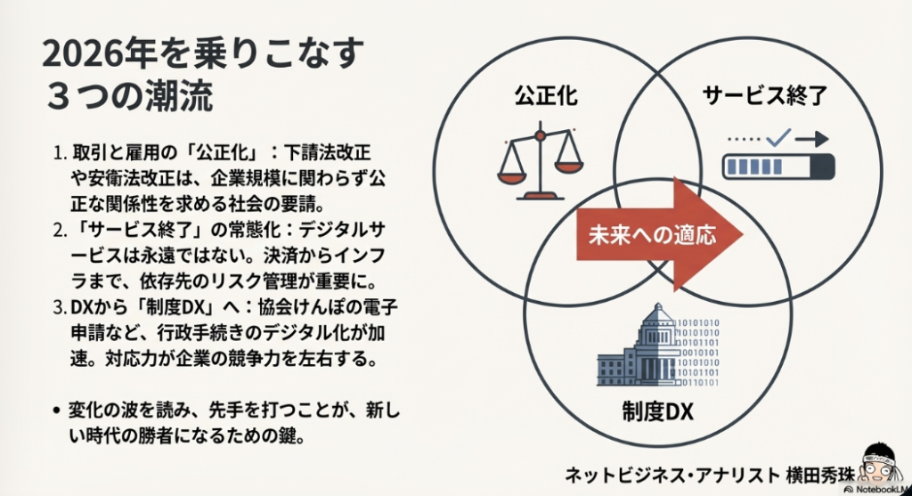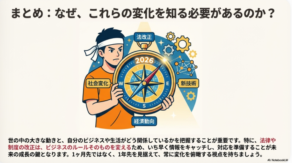 本レポートで分析したように、2026年1月は社会・経済の構造変化、取引ルールの抜本改革、労働規制の進化、デジタルインフラの変革、そして金融・税制の変更といった多岐にわたる変化が集中する、まさに転換点です。