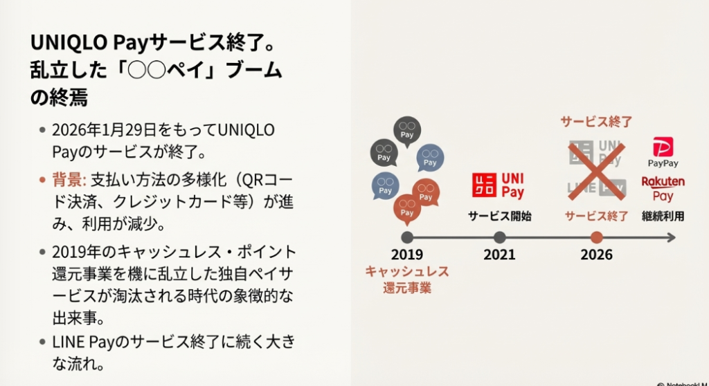 2026年1月15日から1月29日にかけての期間で、「UNIQLO Pay」がサービスを順次終了し、29日が最終稼働日となります。ユニクロの発表によれば、サービス終了の背景には、多様なQRコード決済やクレジットカードの普及といった「支払い方法の多様化」があります。