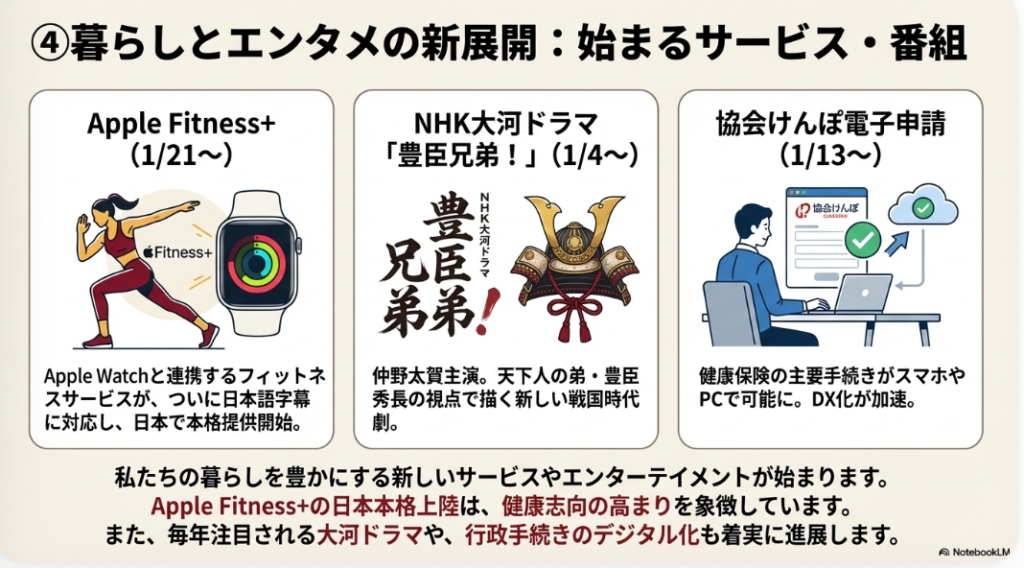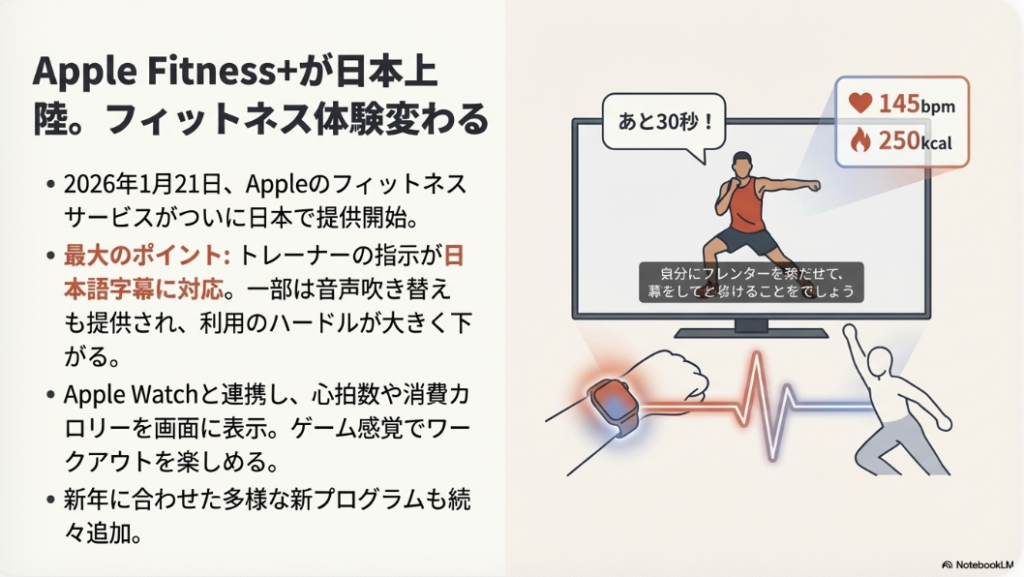 ◦ 2026年1月21日、Appleのフィットネス・ウェルネスサービス**「Apple Fitness+」が日本語字幕に対応**します。これは新規参入ではなく、既存の世界的サービスが日本のユーザーにとって格段に利用しやすくなることを意味します。地域のフィットネスクラブやウェルネス関連事業者は、より身近になった巨大な競合に対し、独自の価値やコミュニティ形成でどう差別化を図るか、戦略の見直しが求められます。