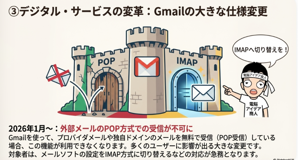 ◦ 2026年1月より、Gmailが外部のメールサーバーからメールを無料で取り込むための「POP方式」のサポートを終了します。独自ドメインのメールをGmailのインターフェースで受信・管理している多くの企業にとって、これは重大な変更です。後継の「IMAP方式」への設定切り替えが必須となるため、IT担当者は早期の確認と対応が求められます。