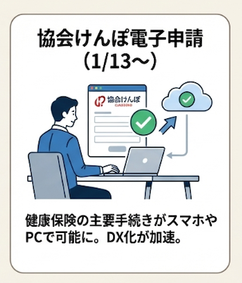 ◦ 2026年1月13日から、全国健康保険協会(協会けんぽ)が**「電子申請サービス」**を開始します。これにより、これまで紙の書類で行っていた傷病手当金や高額療養費などの主要な手続きが、PCやスマートフォンから24時間申請可能になります。総務・人事部門の事務作業を大幅に効率化し、生産性を向上させる絶好の機会です。