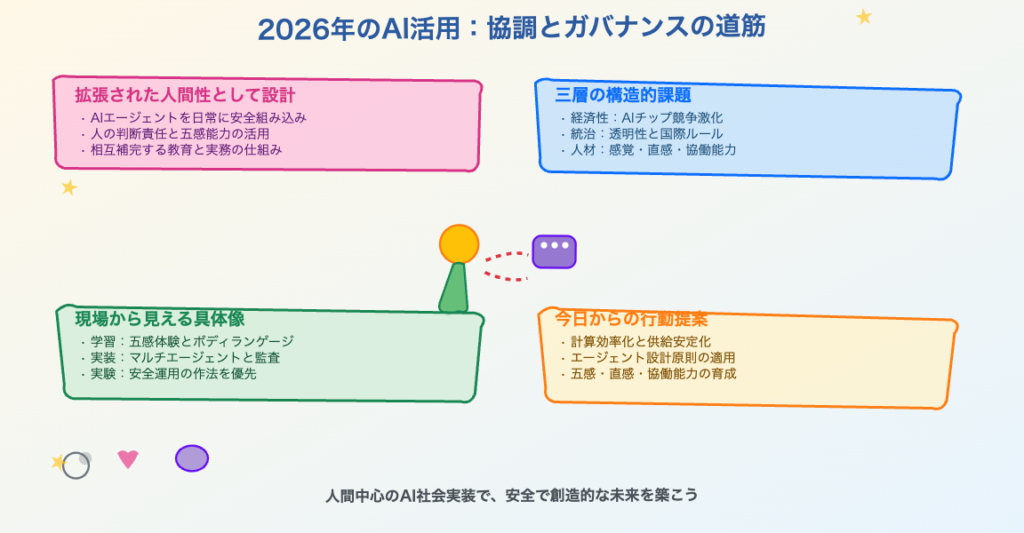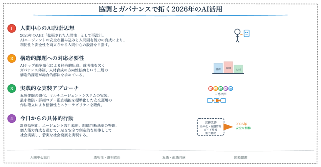 最終的に私たちが目指すべきは、AIと競争することではなく、AIの得意領域と人間ならではの価値を組み合わせ、開発に伴うリスクを賢明に管理しながら協調する道を探ることです。AIは単なるツールではありません。それは、私たち自身の人間性を進化させるための触媒なのです。