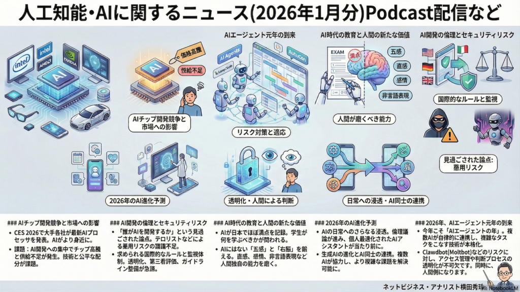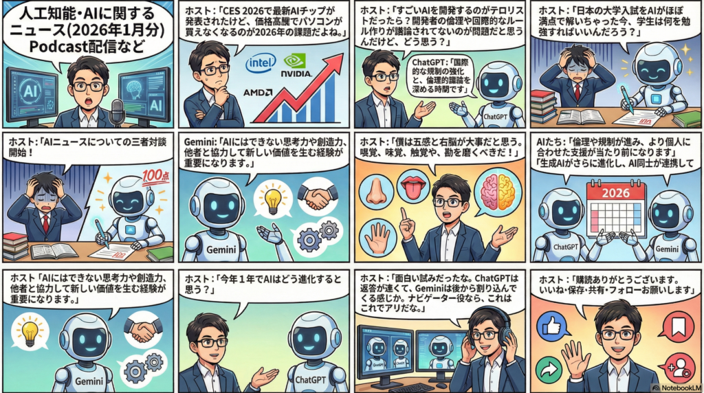 振り返ってみると、CES 2026でのAIチップの進化とそれに伴う半導体価格の高騰問題、AI開発者の責任と国際的な規制の必要性、そしてAIが大学入試でほぼ満点を取る時代における人間の学びのあり方など、非常に重要なテーマについて議論することができました。