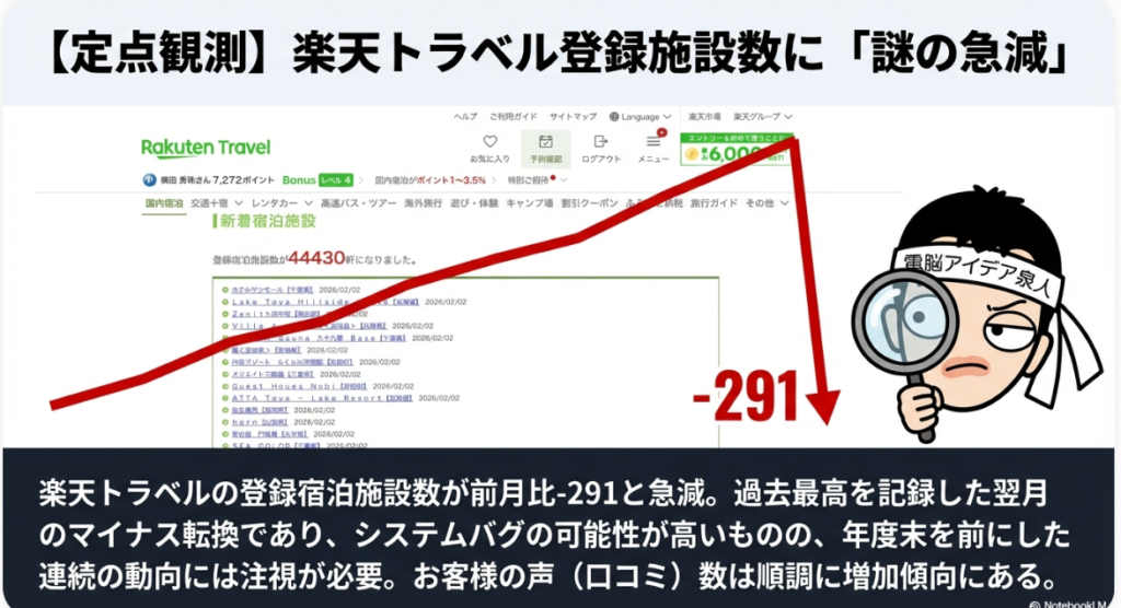 📊 楽天トラベル 楽天が運営する宿泊予約サイトで、登録宿泊施設数を定点観測している。2026年2月に前月比マイナス291という衝撃的な数字を記録し、増加傾向から一転して減少に転じた。過去には増減を繰り返しながらもトータルでは増加傾向にあったため、今後の動向が注目される。年度末の時期でもあり、連続してマイナスになると懸念される状況。