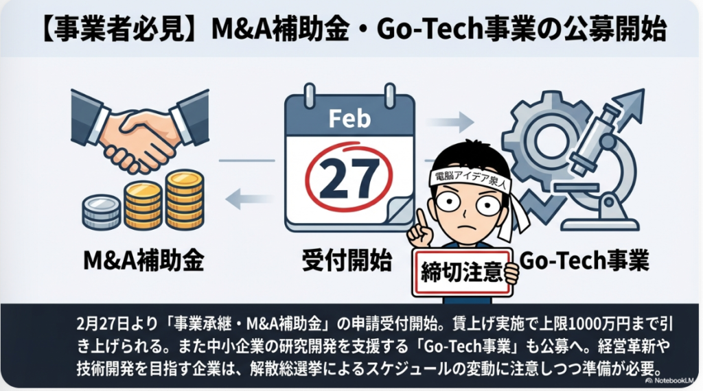 💼 M&A補助金 経済産業省・中小企業庁が2025年度補正予算で実施する事業承継・M&A補助金制度。2026年2月27日から4月3日まで申請受付が行われる。M&Aをきっかけとした経営革新、設備投資、専門家活用にかかる費用を幅広く支援する。東京だけでなく地方でもM&Aの動きが活発化しており、新潟などでも事例が増えている。