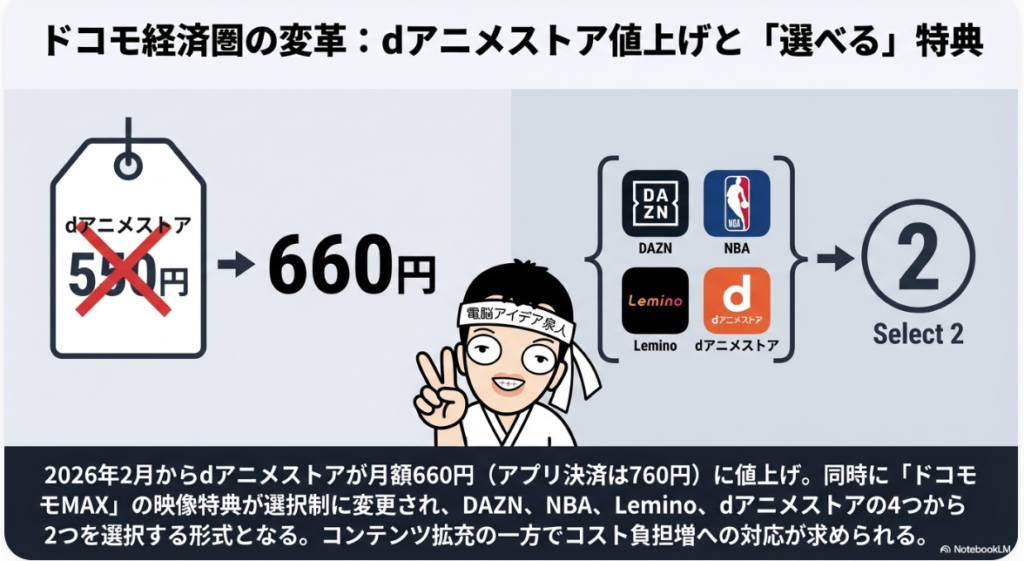 📺 dアニメストア ドコモが提供するアニメ専門の動画配信サービス。2026年2月から月額料金が110円値上げされ、660円となった。配信ラインナップの拡充や新機能の追加によるサービス向上が理由とされている。ドコモMAXの映像特典では、DAZNとNBAに加えてLeminoとdアニメストアが選択肢に加わり、4つから2つを選べる選択制になった。