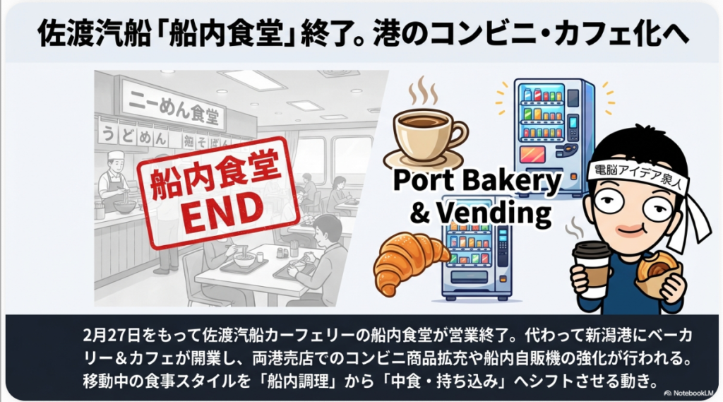 🚢 カーフェリー 佐渡汽船が運営するカーフェリーで、船内で営業していた食堂とスナックコーナーが終了。代わりに新潟港にベーカリー&カフェを設置し、コンビニ機能の充実、両港の食堂ラインナップ強化、自販機の増設などで対応。新幹線の車内販売や駅ホームの食堂など、人的サービスから自動化への移行が交通機関全体で進んでいる傾向がある。
