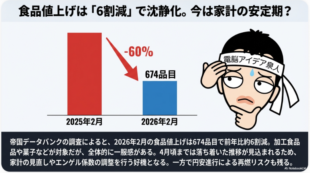 💰 値上げ 2026年2月の食品値上げは674品目で、前年比6割減と落ち着きを見せている。dアニメストアは月額660円へ110円値上げされた。値上げラッシュが一段落したこのタイミングで、消費者は自身の食生活やエンゲル係数を見直し、支出の割合を調整する良い機会とされている。サブスクリプションサービスでも値上げの動きが続いている。