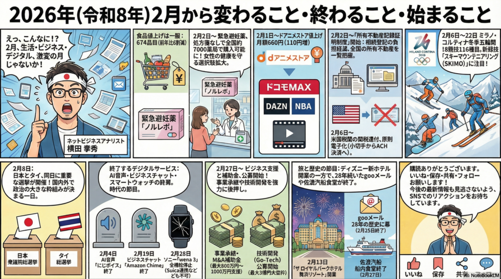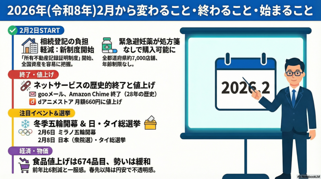 2026年2月から変わることのニュースまとめ。楽天トラベル登録施設数が前月比マイナス291に減少。食品値上げは674品目で前年比6割減と落ち着き。dアニメストアやドコモMAXの映像特典が変更。緊急避妊薬の市販化開始。にじボイス、Amazon Chime、gooメールなど複数サービスが終了。事業承継・M&A補助金とGo-Tech事業の公募開始。佐渡汽船の船内食堂終了やソニーのwena 3終了など、様々な変化が報告された。