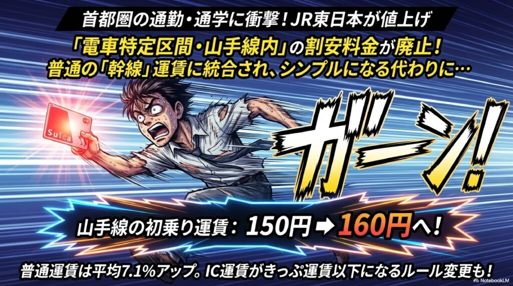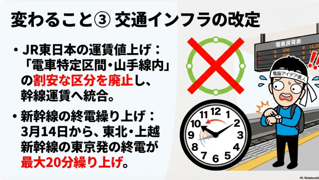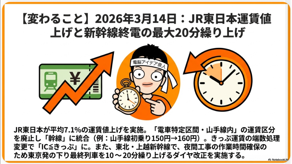 🚄 JR東日本料金体系変更 2026年3月14日からJR東日本が「電車特定区間」「山手線内」の料金区分を廃止します。他社との競争のために設定されていた特別料金体系が見直され、IC運賃と切符運賃の差異も解消へ向かいます。東北・上越新幹線の終電繰り上げも同日から実施されます。