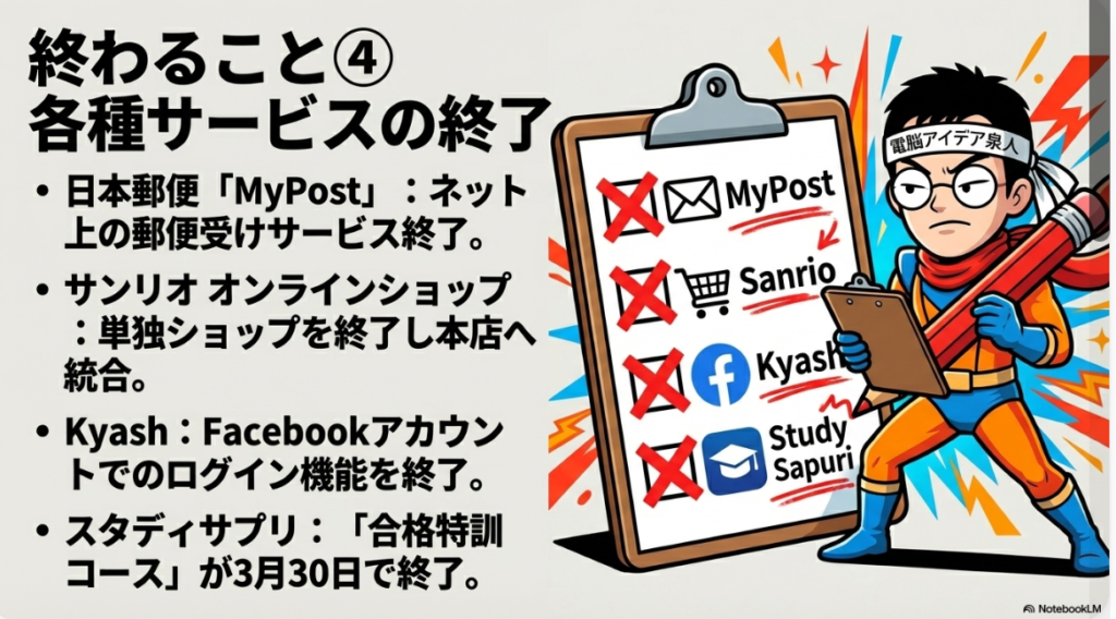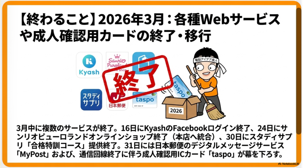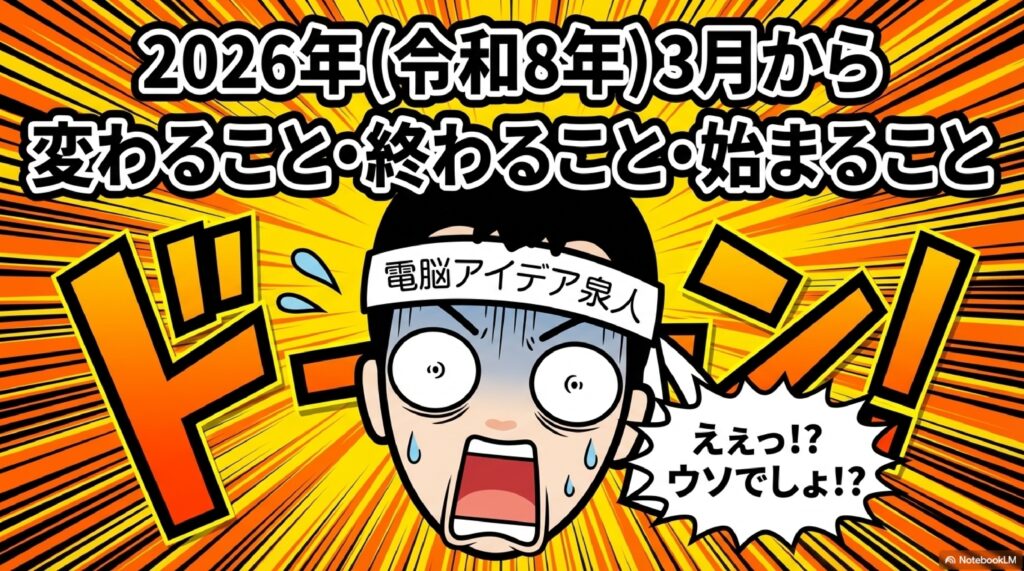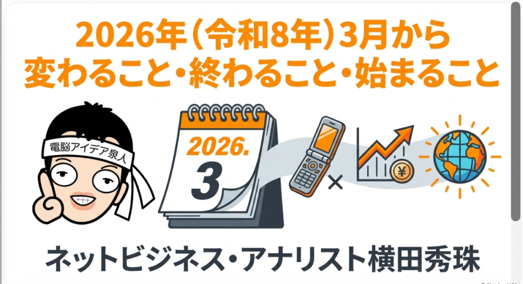 2026年も早いもので3月に入りました。年度末が近づくこの時期は、毎年さまざまなサービスの終了や新制度のスタートが集中するタイミングでもあります。「気づいたら使っていたサービスが終わっていた」「知らないうちに値上がりしていた」——そんな経験、皆さんにもあるのではないでしょうか。