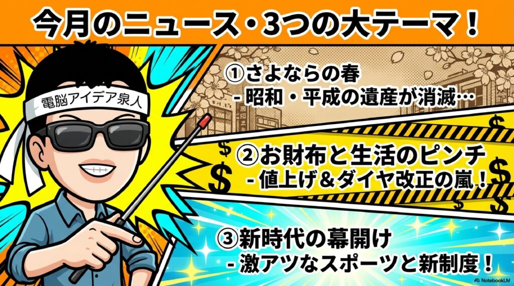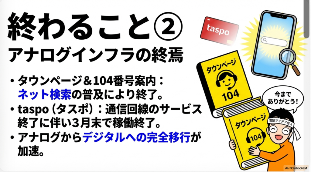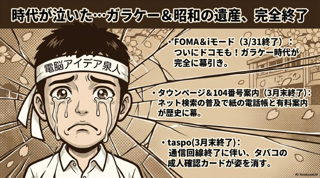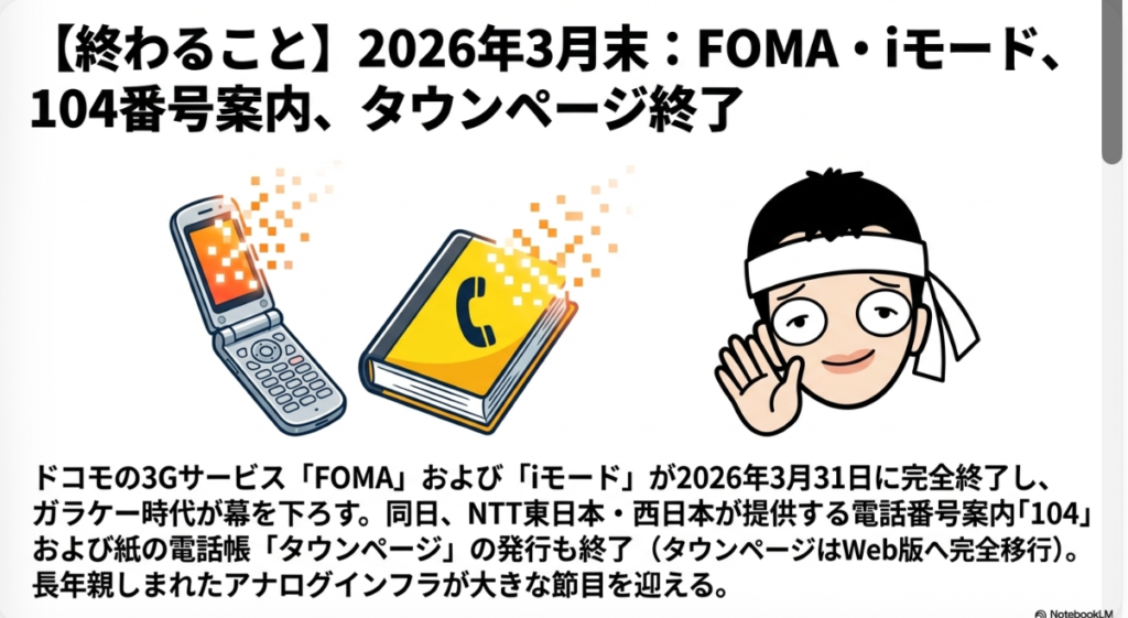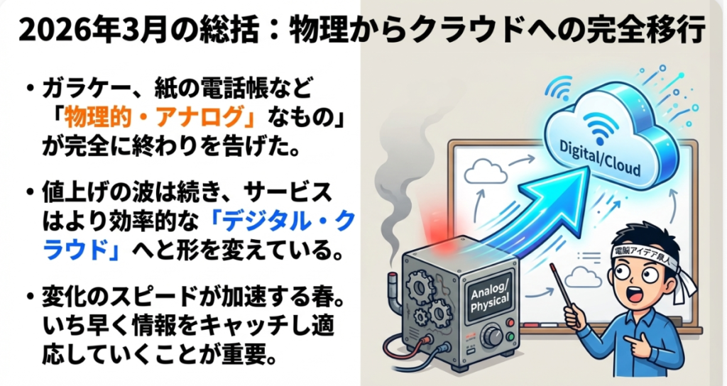 📌 アナログからデジタルへの移行が加速した月。ブルーレイ・ガラケー・タウンページ・ラジオ第2…昭和〜平成を支えたインフラが次々と幕を下ろす一方、4月以降の法改正・値上げにも早めの対応が必要。