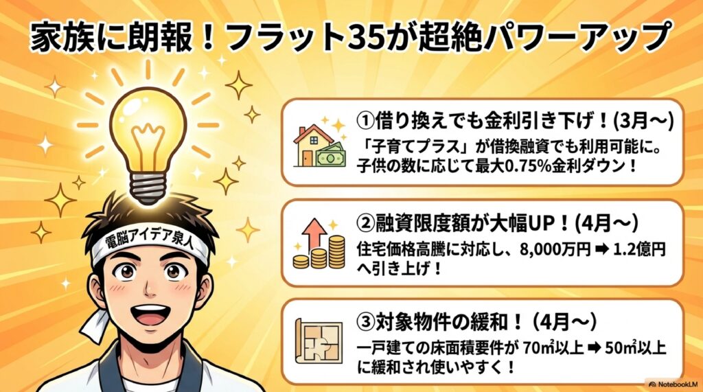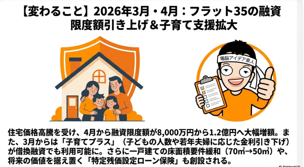 🏠 フラット35改正 住宅ローン「フラット35」に4つの改正が実施され、借り換え融資でも子育て世帯を対象とした金利引き下げが適用されるようになりました。住宅購入やローンの借り換えを検討している子育て家庭にとっては、負担軽減につながる重要な制度変更です。