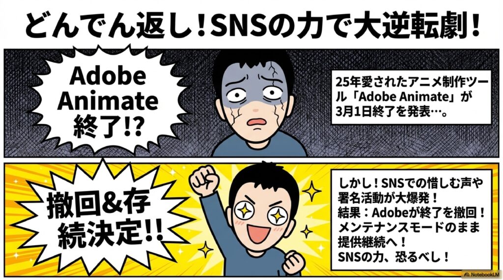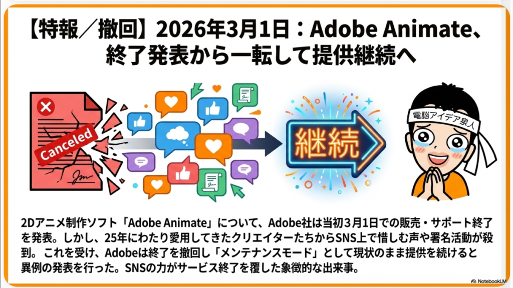 🎨 Adobe Animate存続 25年の歴史を持つ2Dアニメーション制作ツール「Adobe Animate」が3月1日でサービス終了と発表されましたが、ユーザーの反対運動や署名活動を受けて撤回されました。アップデートはないメンテナンスモードでの提供継続となり、SNSの力がサービス存続を動かした好例です。