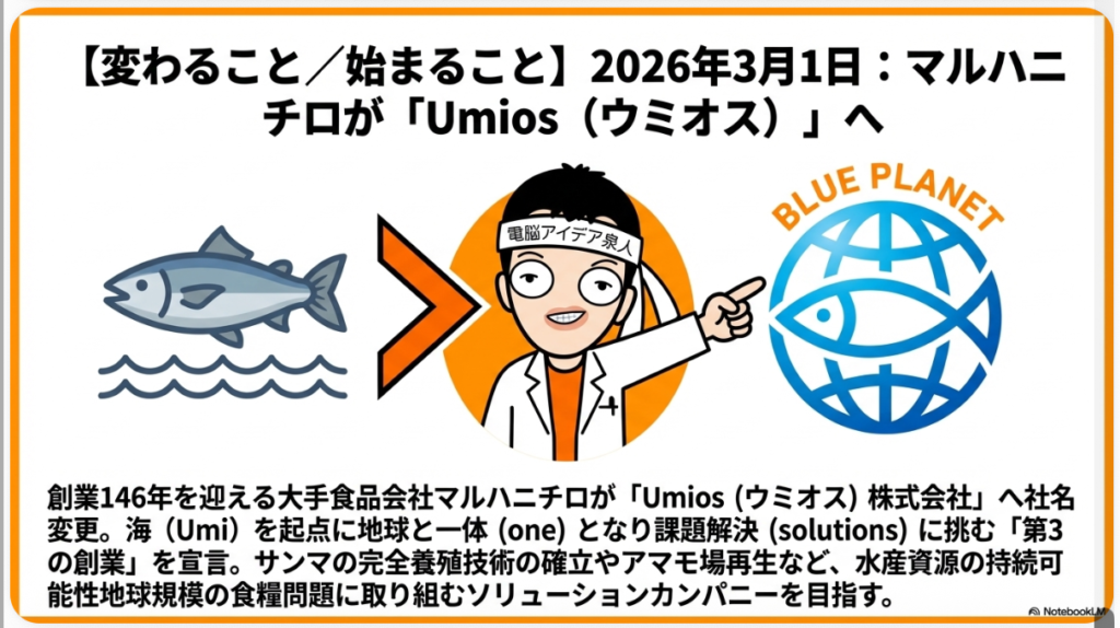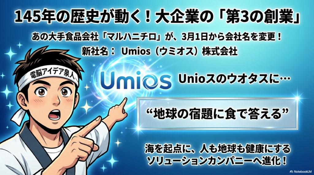 2026年3月1日、大手食品会社のマルハニチロが「Umios(ウミオス)株式会社」に社名を変更しました。マルハニチロという名前は長年にわたって高い知名度を誇ってきましたが、145年の歴史を経て「第3の創業」と位置付ける大きな転換点を迎えたことになります。第1の創業が1880年・1907年、第2の創業が2007年のマルハとニチロの経営統合であり、今回が第3の創業フェーズとなります。