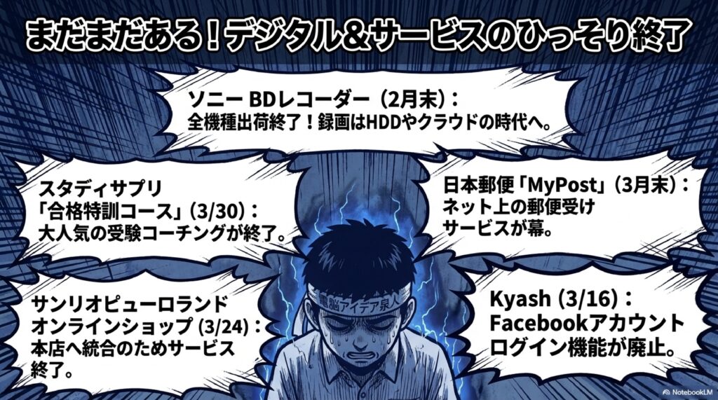 今回は、2026年2月末で終了したことと、3月から新たに変わること・始まることを一気にまとめてお届けします。ソニーのブルーレイディスクレコーダーの出荷終了、食品の値上げ、FOMAとiモードの完全終了、そしてスーパー戦隊シリーズの幕引きまで、私たちの生活に直結するニュースが目白押しです。