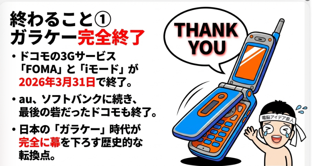 📱 FOMA・iモード終了 NTTドコモの3G回線サービス「FOMA」と携帯インターネットサービス「iモード」が2026年3月31日で終了します。au・ソフトバンクは既に終了しており、これで日本のガラケーは完全に幕を閉じます。一時代を築いたモバイル通信技術の歴史的な節目となります。
