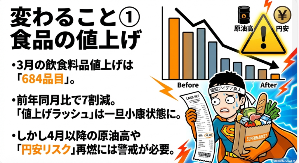 A4. 2026年3月の食品値上げは684品目で、前年比7割減と小康状態にあります。しかし、4月には再び大幅な値上げが予定されている品目があるとされています。さらに、アメリカとイランの国際情勢の影響で石油価格や物流コストが上昇する可能性もあり、輸入品を中心にさらなる値上げの波が来るリスクがあります。国産品を積極的に活用するなど、家計の防衛策を考えておくことをおすすめします。