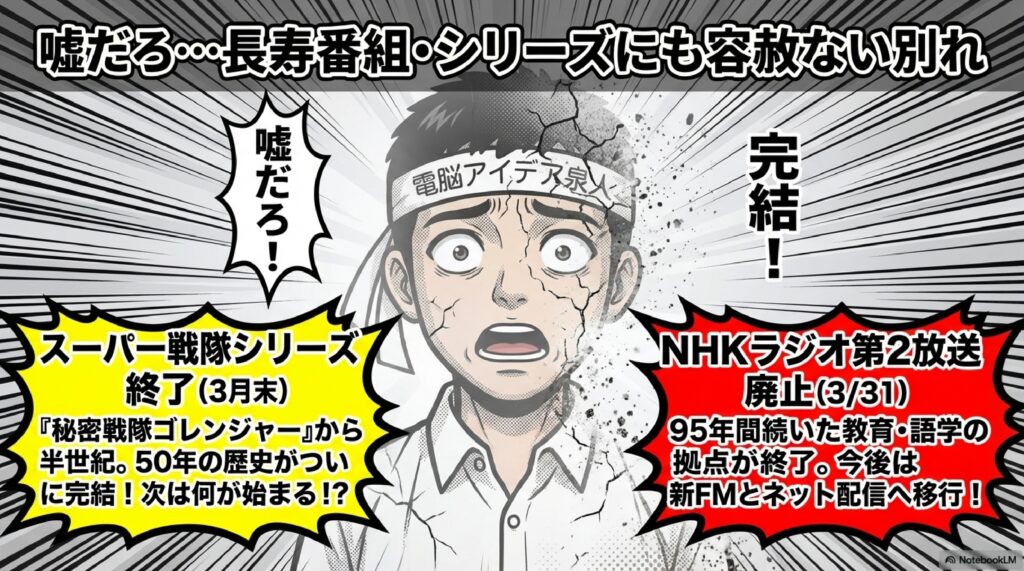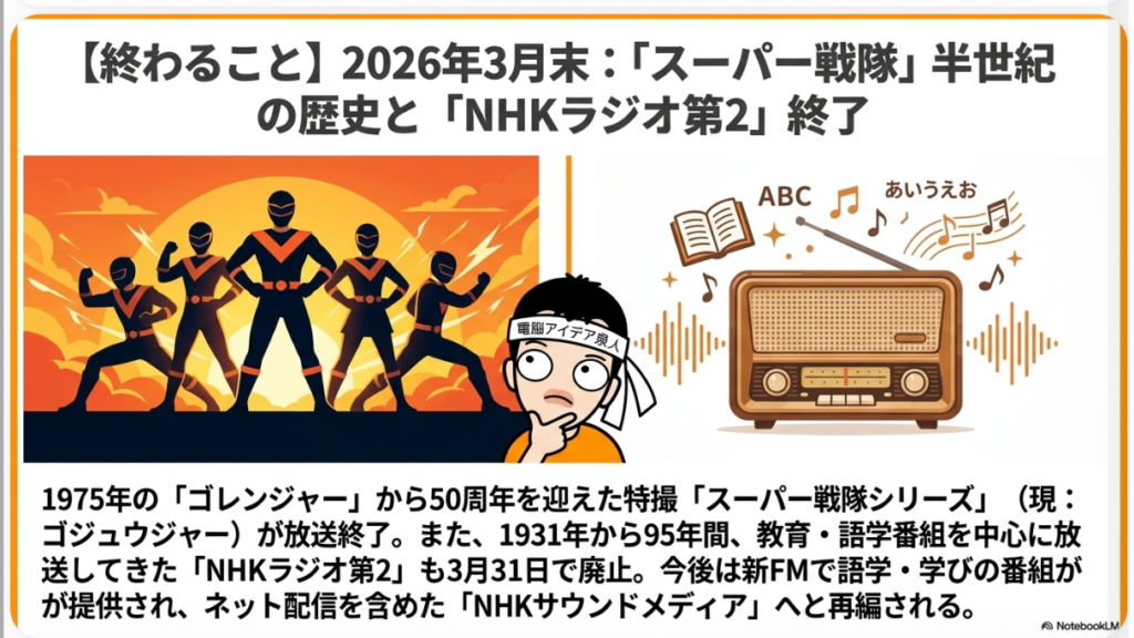 📻 NHKラジオ第2放送終了 教育放送として長年親しまれてきたNHKラジオ第2放送が2026年3月31日で終了します。放送大学的な学習手段としても活用されてきましたが、今後はネット配信を含む「NHKサウンドメディア」として再編される予定で、放送のデジタル移行が加速しています。