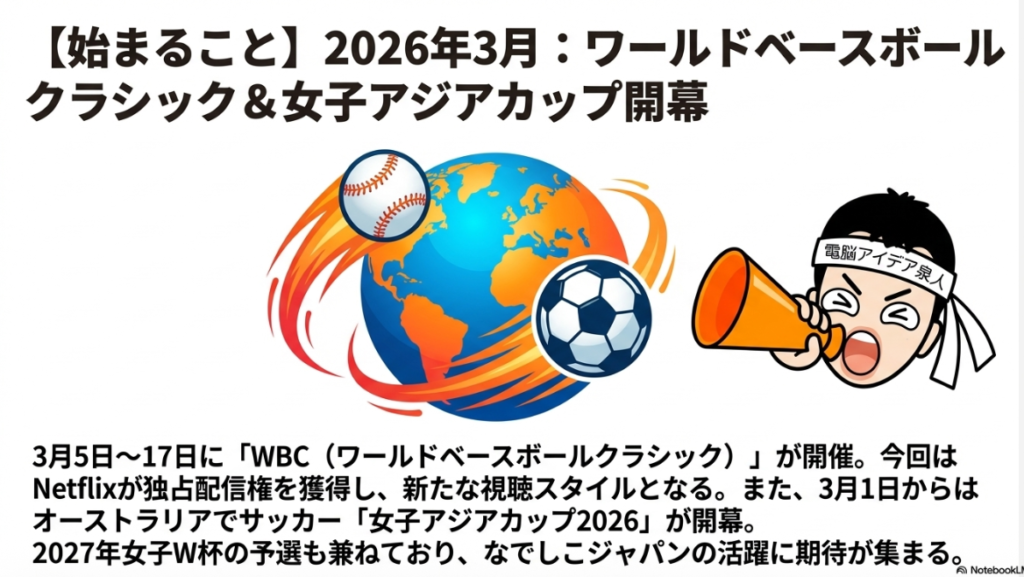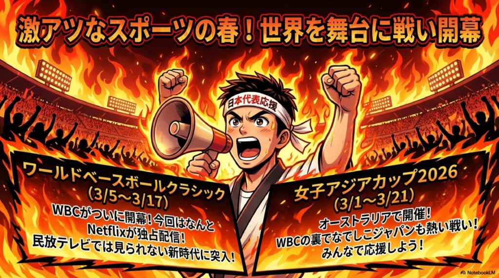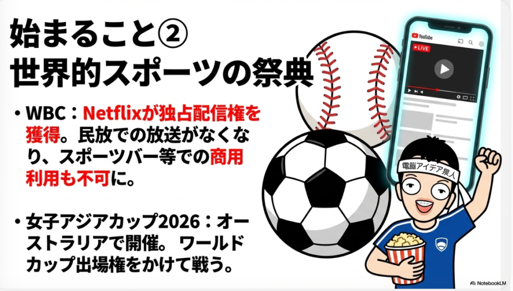 📺 Netflix WBC独占配信 2026年のワールドベースボールクラシック(WBC)の放映権をNetflixが独占取得しました。高額な放映権料をテレビ局が支払えなかったことが背景にあります。Netflixは日本でオリジナル作品の視聴率が低いため、スポーツ独占配信で加入者を増やす戦略をとっています。
