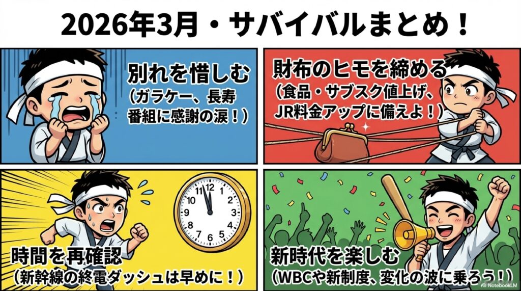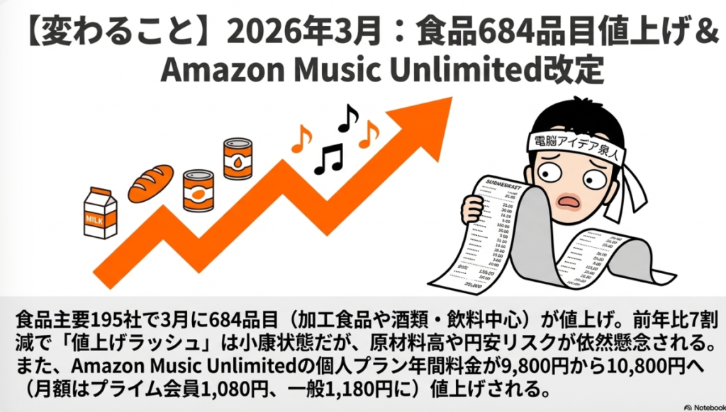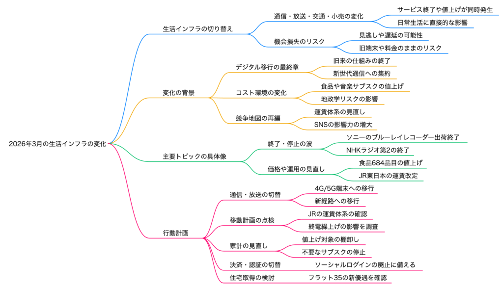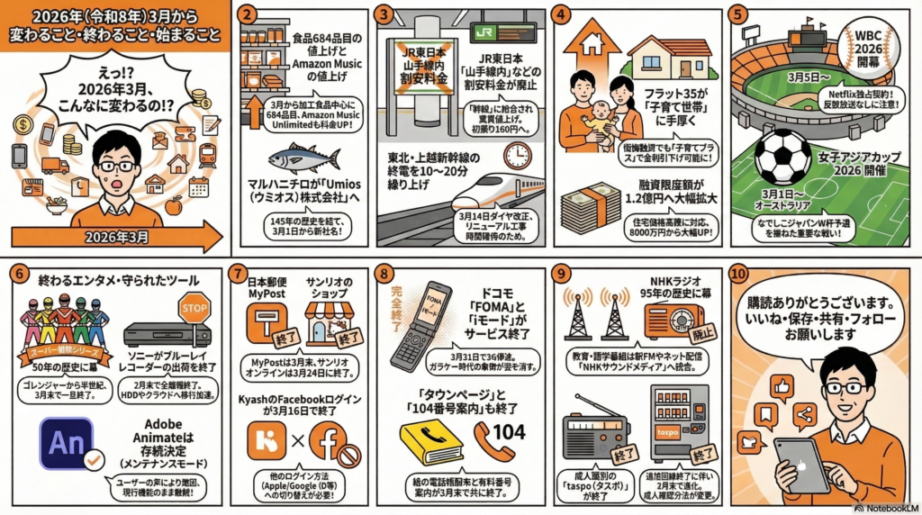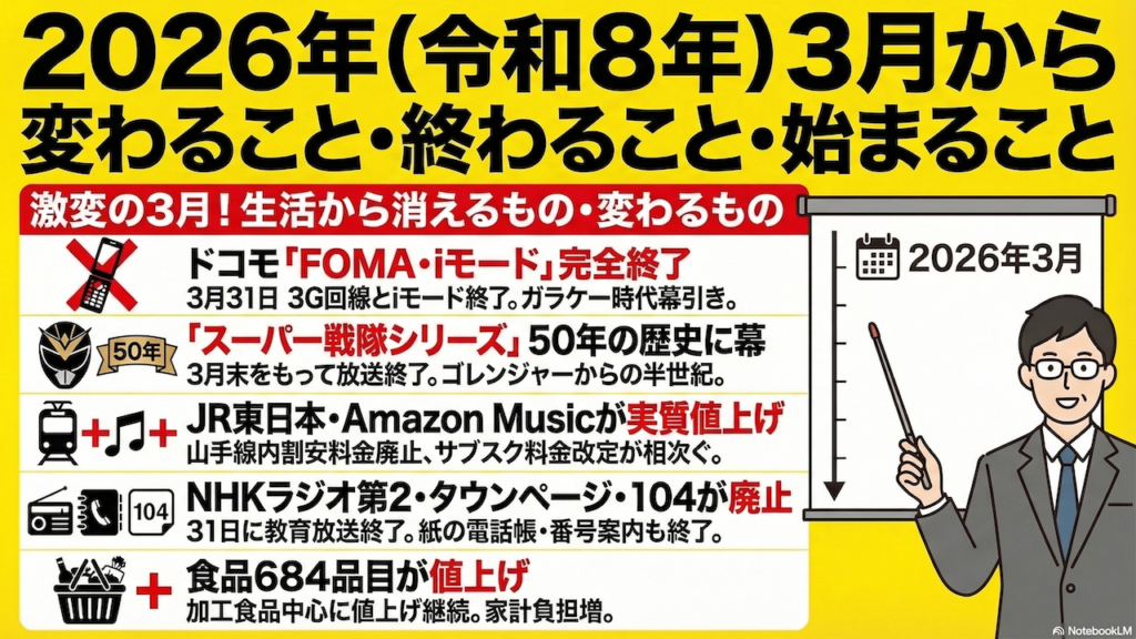 2026年3月は多くのサービス終了・変更が集中する月です。ソニーのブルーレイレコーダー出荷終了、FOMA・iモード終了によるガラケー完全終了、NHKラジオ第2放送の終了など、時代の転換を象徴するニュースが並びます。一方、食品684品目の値上げやAmazon Music値上げなど生活コスト増も継続。WBC開催やJR東日本の料金体系変更、フラット35改正など新たな動きもあり、4月の法改正に向けた準備も呼びかけられています。