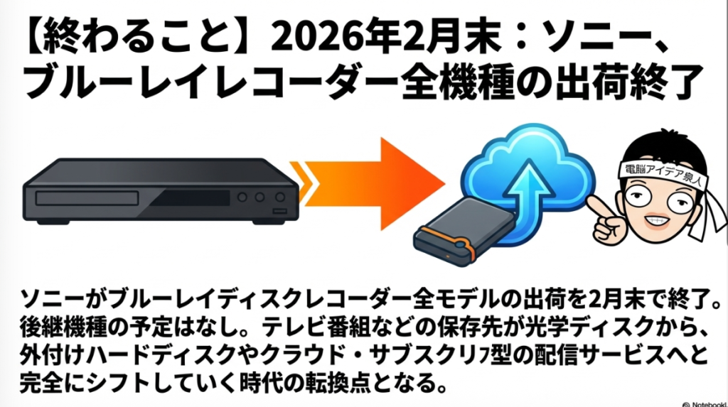 💿 ブルーレイディスクレコーダー ソニーが2026年2月末に全機種の出荷を終了し、後継機種の予定もないと発表しました。テレビ録画の主流メディアが消え、今後はハードディスクやクラウド保存へと移行する大きな転換点です。サブスクリプション型の映像視聴が広がる時代を象徴する出来事といえます。