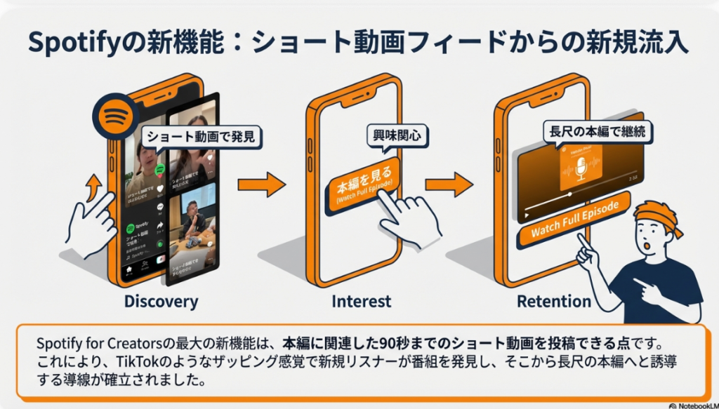 📱 ショート動画連携 Spotifyに新たに追加された機能で、ビデオポッドキャストの一部分を90秒以内のショート動画として切り出し、Spotifyアプリのタイムラインフィードに流せる仕組み。未知のリスナーがショートを視聴して本編へ誘導される「ザッピング効果」が生まれ、新規発見の導線として機能する現代SNSの主流トレンドにも合致している。