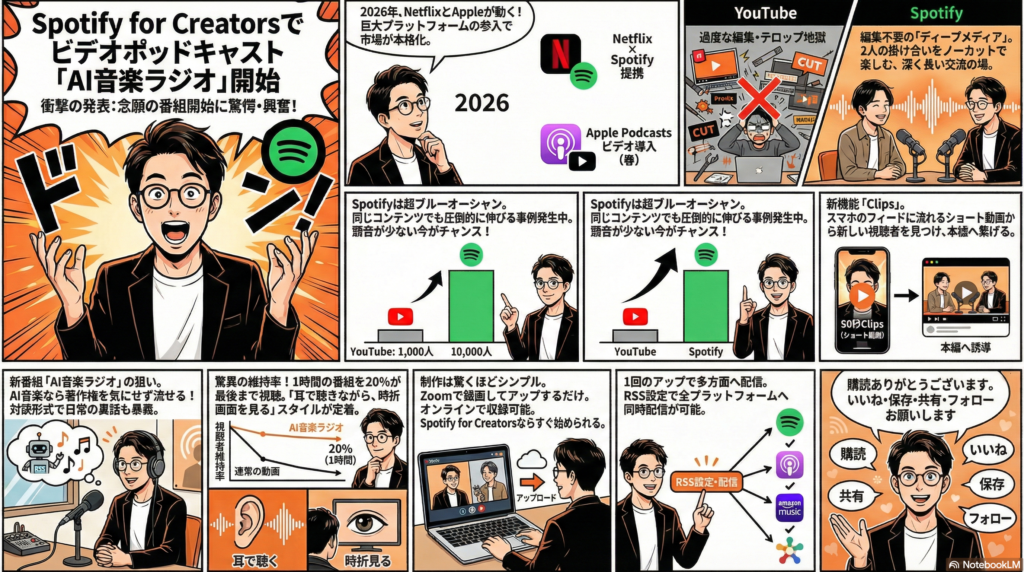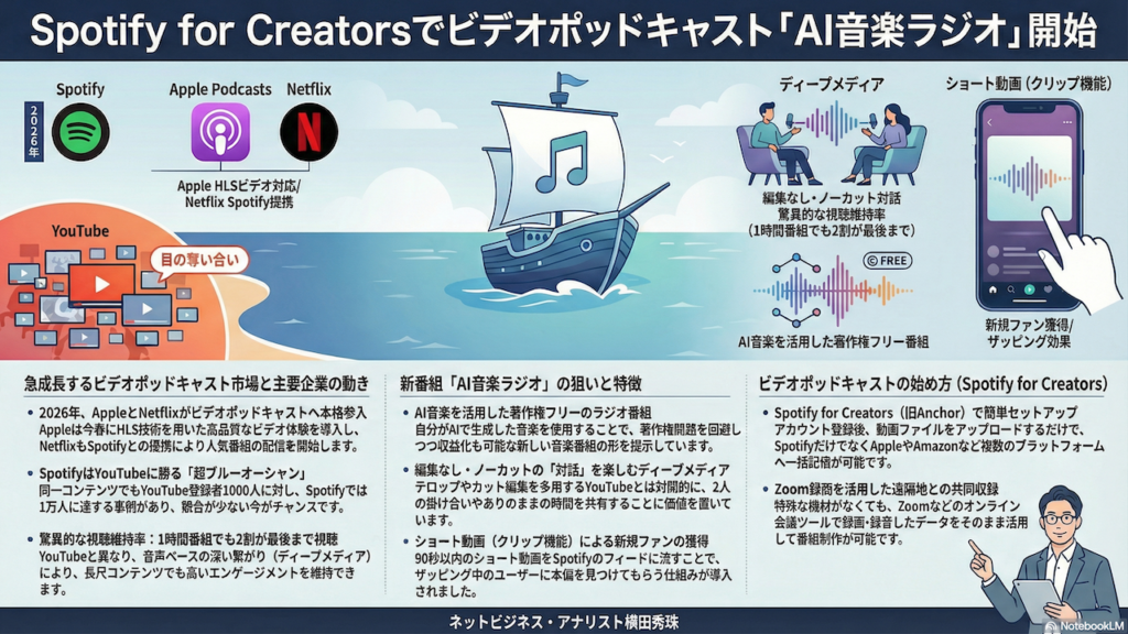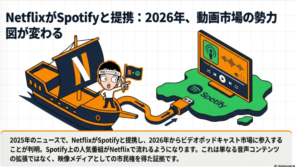 🎬 NetflixとSpotifyの提携 2026年よりNetflixとSpotifyが連携し、Spotify上のビデオポッドキャスト番組をNetflixでも視聴できるようになる取り組み。世界最大級の動画配信サービスとの連携により、Spotifyのビデオポッドキャストコンテンツの露出が大幅に拡大。この提携がビデオポッドキャスト市場の急成長に火をつけた。