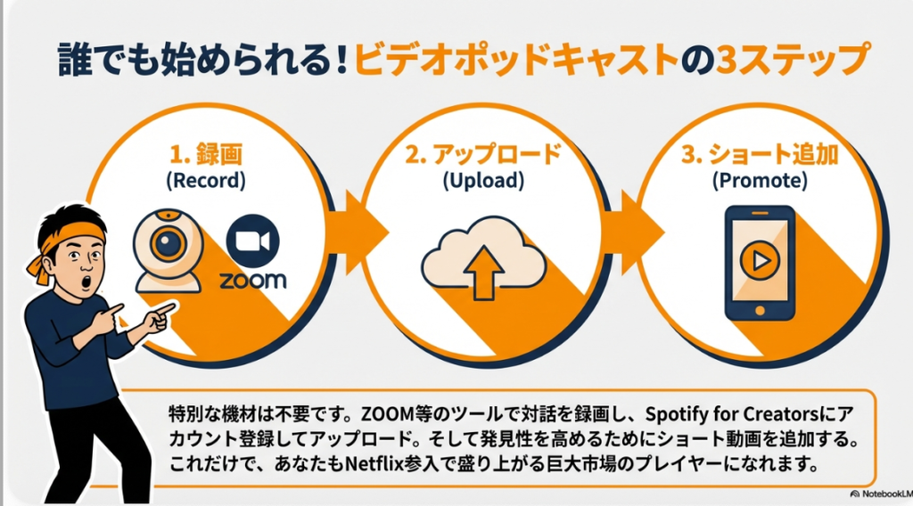 配信方法はシンプルで、ZOOMで録画してSpotify for Creatorsにアップロードするだけ。RSS連携により複数プラットフォームへの同時配信も可能で、新しく追加されたショート動画機能によって新規ユーザーへのリーチも広がりました。さらに視聴者維持率の高さという驚きのデータも、このメディアの可能性を証明しています。
