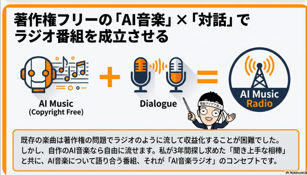 🎵 AI音楽 人工知能を活用して生成・制作された音楽のこと。著作権が制作者自身に帰属するため、ラジオやポッドキャスト番組内で自由に流すことができ、収益化も可能。一般の楽曲のような著作権上の制限がなく、AI音楽を素材に使った番組コンテンツは新しいポッドキャスト活用の形として注目されている。