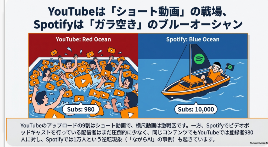 🌊 ブルーオーシャン 競合が少なく、参入余地が大きい市場のこと。ビデオポッドキャストはYouTubeと比べてコンテンツ数が圧倒的に少なく、競争が緩やかな状態にある。実際、あるチャンネルではYouTubeの登録者が1000人未満でも、Spotifyでは1万人のフォロワーを獲得した事例があり、その可能性の大きさが示されている。