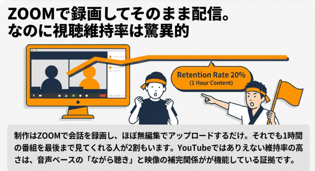 YouTube的な感覚で言うと、長尺動画を最後まで見てもらえる割合というのは非常に低くなりがちです。それが1時間番組で2割というのは、通常では考えられないほどの高い数字です。これはビデオポッドキャストという形式と、その視聴者特性が生み出す独自の強みといえます。