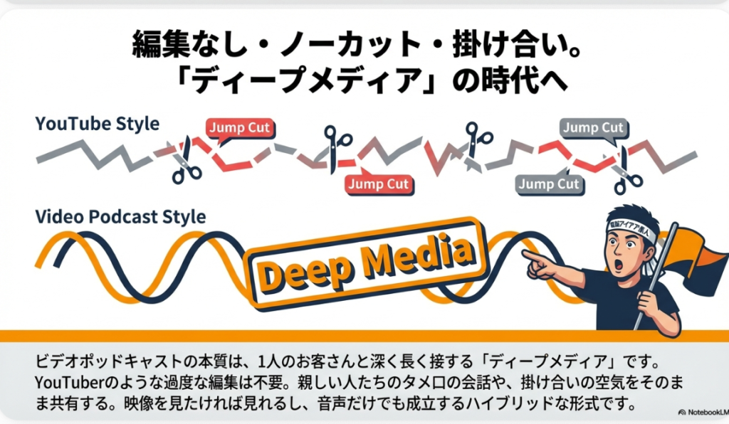 🤝 ディープメディア 不特定多数への広く浅いアプローチではなく、特定のリスナーと長く深く関係を築くメディア戦略のこと。ビデオポッドキャストは1時間超の長尺コンテンツでも視聴維持率が高く、ファンとの濃密な関係構築に向いている。これからのメディアは「広さより深さ」を重視するべきという考え方を表している。