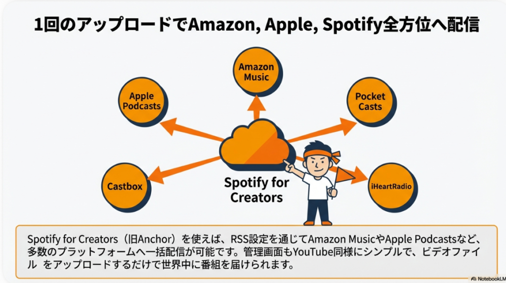 🟢 Spotify for Creators 元々「Anchor」というサービスだったが、SpotifyによるAnchor買収後に現在の名称へ変更。アカウント登録後すぐに番組を開設でき、ビデオポッドキャストのアップロードや管理が可能。RSS設定を活用することで、Amazon MusicやApple Podcastsなど複数のプラットフォームへの同時配信も実現できる。