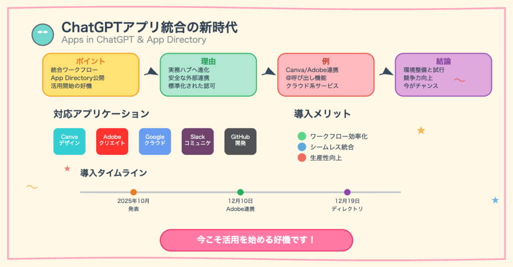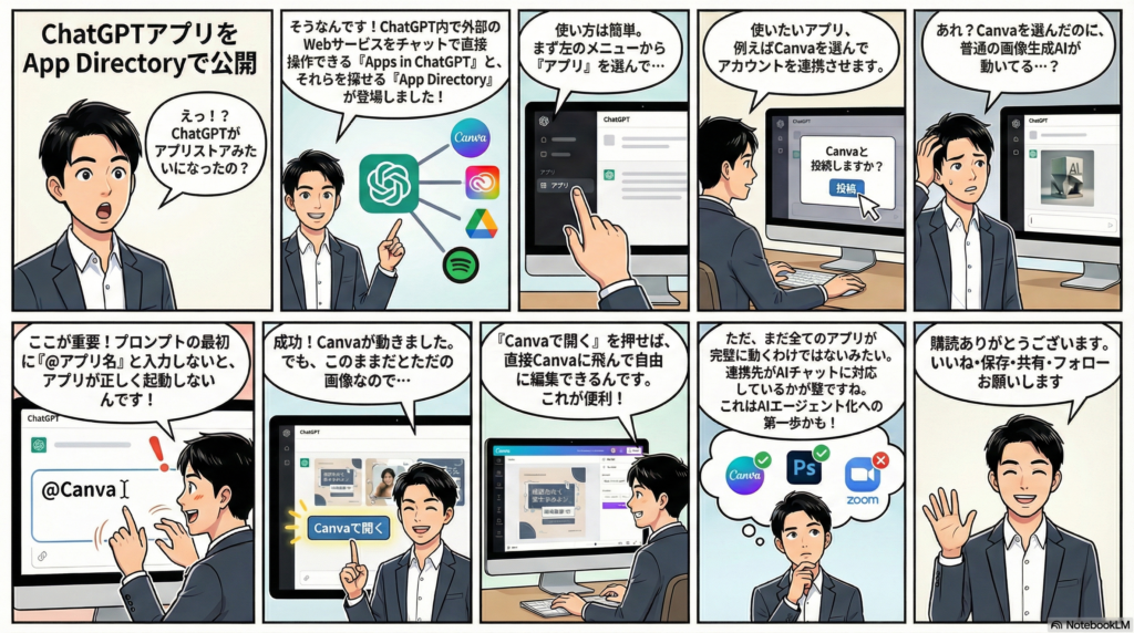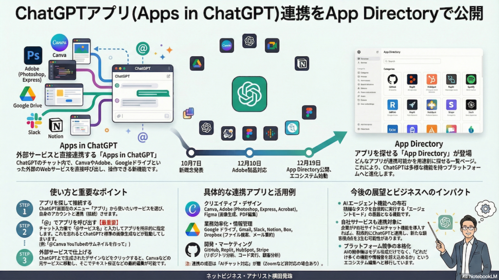 ChatGPTアプリ(Apps in ChatGPT)連携をApp Directory公開 2025 12/25 その他 2025年12月25日 URLをコピーしました! 詳しくは15分の動画で解説しました。https://www.youtube.com/watch?v=W8-2goTRxhE その他 人工知能(AI):コンサルタントによるセミナー講演講師 よかったらシェアしてね! URLをコピーしました! AIブラウザ操作のChrome拡張機能「Claude in Chrome」使い方 この記事を書いた人 横田 秀珠 (新潟)公立長岡造形大学 情報リテラシー論 講師 ネットビジネス・アナリスト。未経験のIT企業に就職し、たった3年で独立し、2007年にITコンサルタント会社のイーンスパイア(株)を設立し現在に至る。All About ProFile全専門家で全国1位のコラム評価を獲得した実績を持つ。全国で年間200回を超える講演も行う。 関連記事 AIブラウザ操作のChrome拡張機能「Claude in Chrome」使い方 2025年12月24日 動画生成AIのNoLang「キャラ作成」で自分のアバターで動画解説 2025年12月23日 情報リテラシー論13画像認識と生成技術で革新’25長岡造形大学 2025年12月22日 生成AIで業務改善して仕事は減らずに増えて生産性が上がるだけ 2025年12月21日 商品検索における生成AI活用の実態調査レポート2025(いつも) 2025年12月20日 Yahoo!「選ぶ」Google「探す」ChatGPT「聞く」対応したUIのHPへ 2025年12月18日 ChatGPT画像生成モデルGPT-Image1.5はThinkingモード推奨 2025年12月17日 情報リテラシー論12ラジオと音声技術の未来性’25長岡造形大学 2025年12月16日