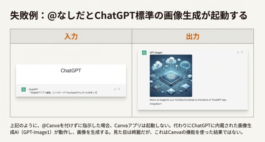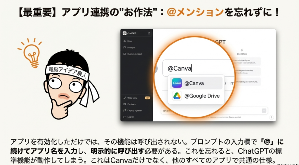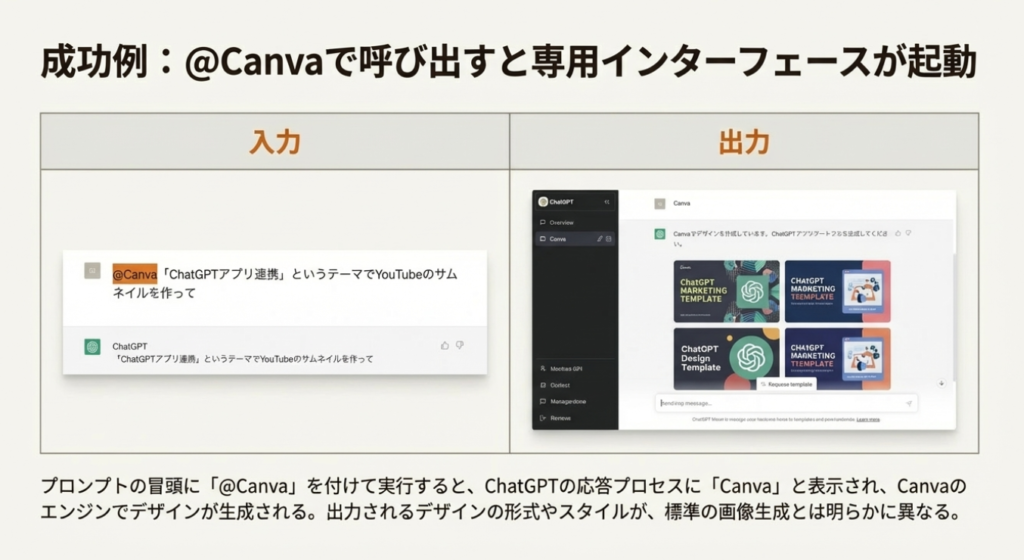 1. 起動方法: 連携を成功させるための決定的な操作は、チャットプロンプト冒頭で「@Canva」と入力し、アプリを明示的に呼び出すことです。これを怠ると、ChatGPT標準の画像生成機能が作動してしまい、意図した連携は実行されません。