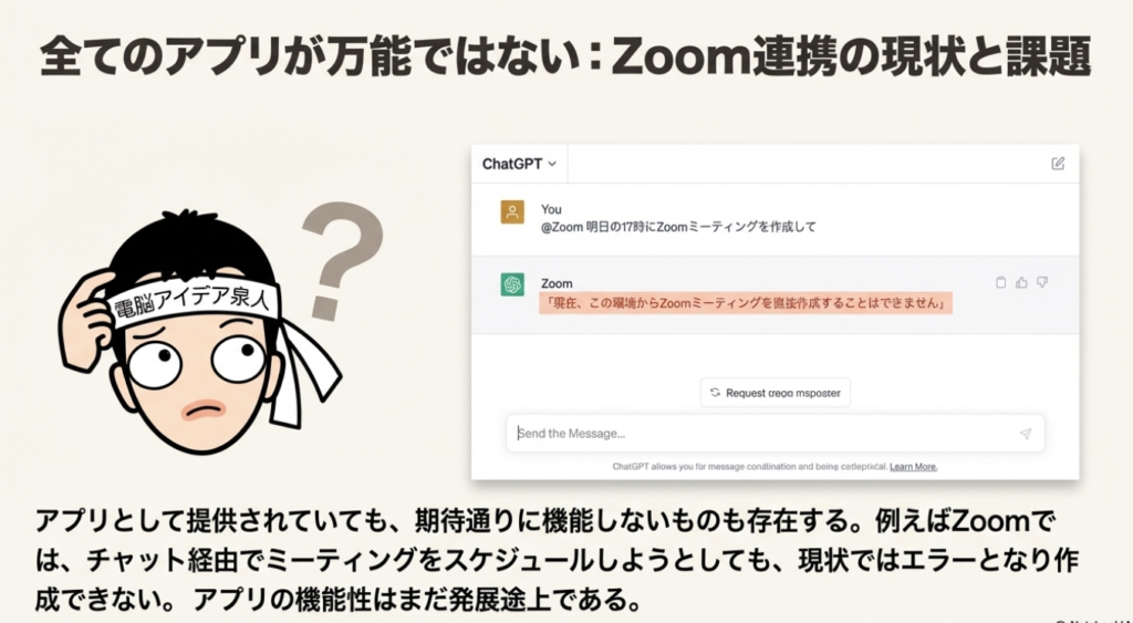 「明日の17時にZoomミーティングを作成して」といった、多くのユーザーが期待するであろう指示に対して、アプリは「現在、この環境からZoomミーティングを直接作成することはできません」というエラーメッセージを返します。