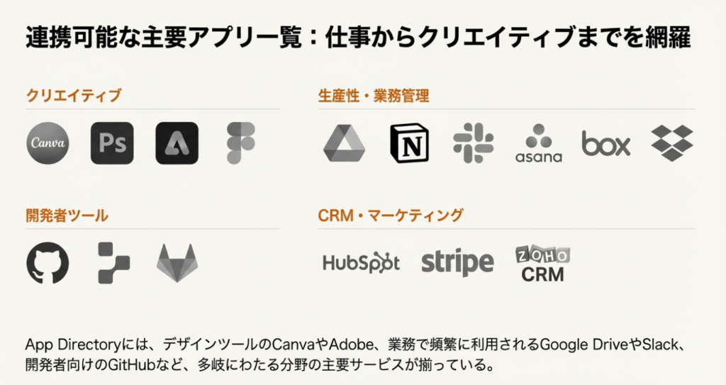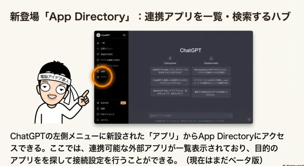 📂 App Directory 2025年12月19日に公開された、ChatGPTで利用可能な外部アプリやAIツールを一覧化したカタログです。ChatGPTの左メニュー「アプリ」からアクセスでき、連携可能なサービスを確認・接続できます。現在はベータ版として提供されており、今後さらに対応サービスが増える見込みです。