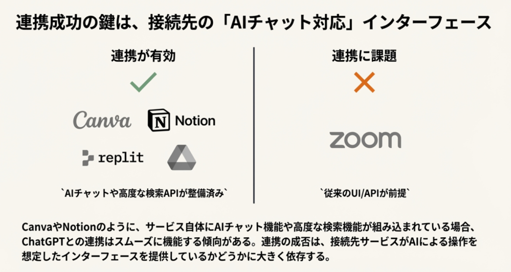 2. 連携の技術的要件: 円滑な連携の前提条件として、連携先サービス側が従来のキーワード検索ベースのシステムに留まらず、AIチャット(大規模言語モデル)を理解し、対話的に応答できるインターフェースを導入していることが極めて重要です。Zoomの失敗は、この要件を満たせていないことに起因します。