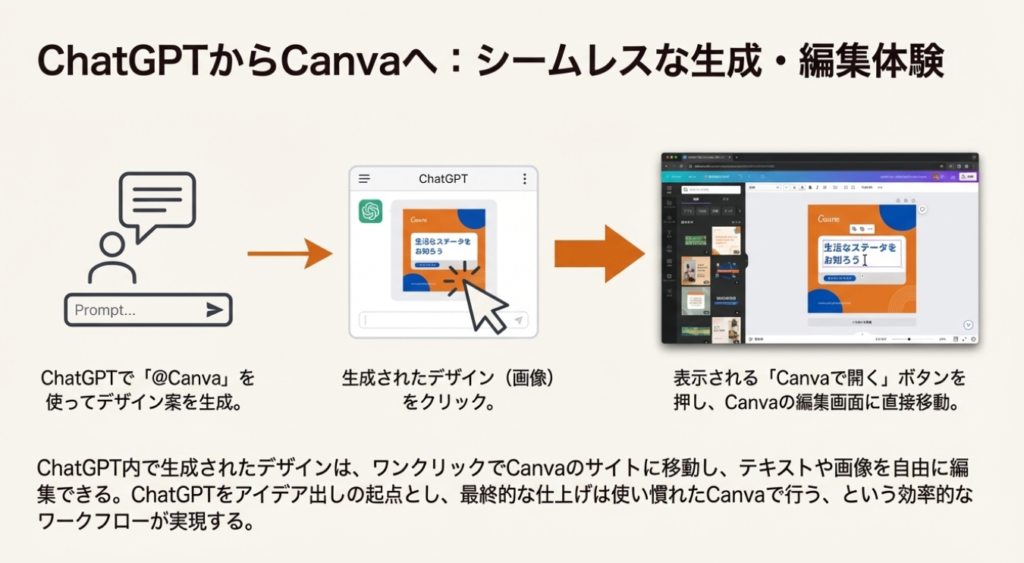 Canvaとの連携は、ChatGPTでのアイデア出しから専門ツールでの編集までを滑らかに繋ぐ、優れたユーザー体験を提供しています。
