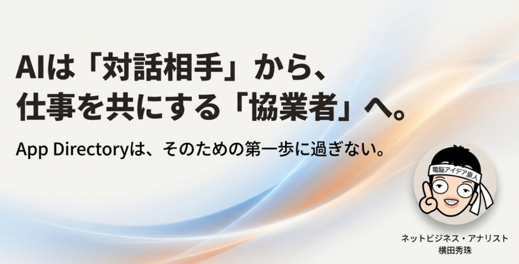 • ChatGPTのアプリ連携機能は、AI市場の競争軸を「モデル性能競争」から、いかに多くのサービスを巻き込むかという「エコシステム競争」へと完全に転換させるゲームチェンジャーです。