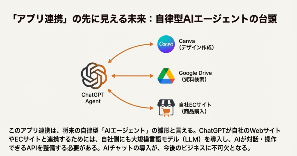 • 将来のAIエージェントへの布石 ChatGPTはやがて、ユーザーの曖昧な指示を解釈し、複数のアプリを自律的に連携させてタスクを遂行する「エージェントモード」へと進化していくと予測されます。この未来において、連携済みのサービスはAIエージェントが利用する「ツール」として自動的に選択される対象となります。早期に連携を実現しておくことは、AIエージェントが普及した時代のエコシステム内で、競合に先んじて確固たる地位を築くための長期的な投資となります。