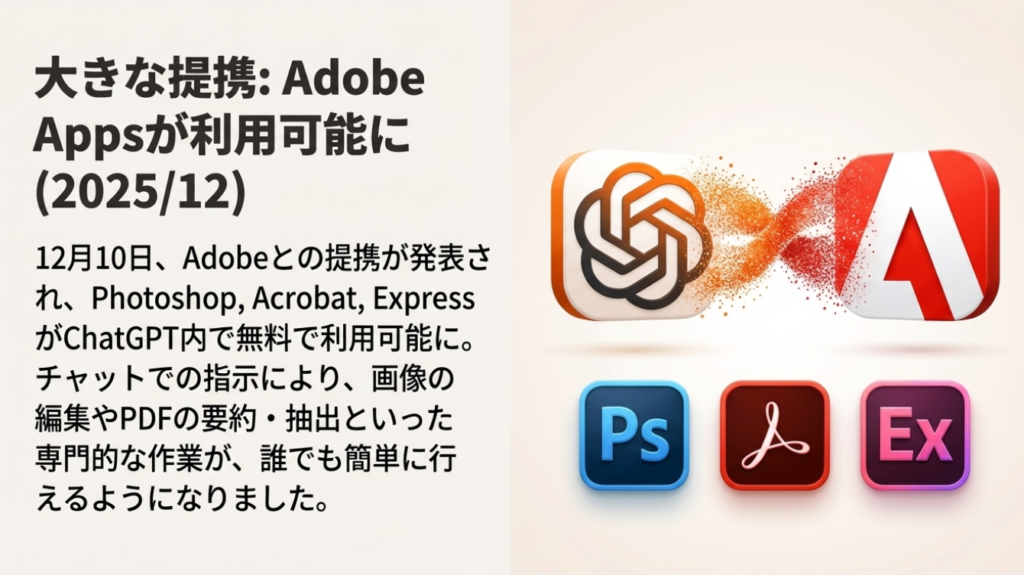 🖼️ Adobe Apps for ChatGPT 2025年12月10日に提供開始されたAdobe連携機能です。Photoshop、Acrobat、ExpressがChatGPT上で無料利用可能になりました。Canvaと同様、画像生成やチラシ作成などをチャット経由で行えます。プロ向けデザインツールが手軽に使える点が魅力です。