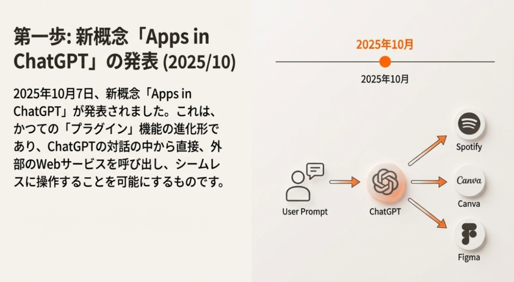 • 2025年10月7日: 新概念「ChatGPTアプリ (Apps in ChatGPT)」発表¹