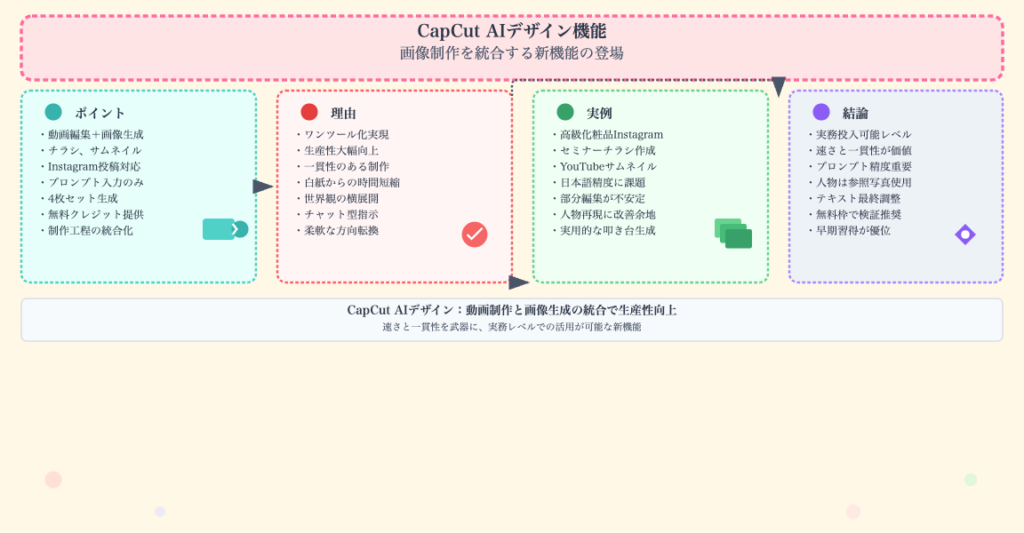 🎨 AIデザイン CapCutに新たに追加された画像生成機能。チラシやサムネイル、SNS投稿などのビジュアルコンテンツをAIが自動生成する。テンプレート選択ではなく、プロンプト入力でゼロからデザインを作成できる点が特徴。Canvaのようなデザインツールと、Gensparkのような生成AI機能を組み合わせた新しいタイプのクリエイティブツールとして注目されている。